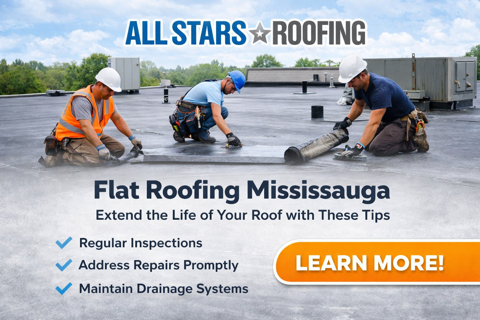 At All Stars Roofing, we help Mississauga property owners maintain and extend the life of their flat roofs with reliable inspections, repairs, and maintenance services.